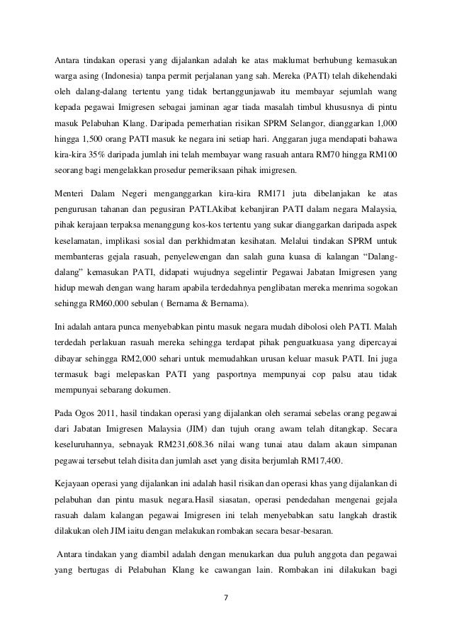 Pembukaan kilang ini memerlukan tenaga kerja yang ramai dan membuka peluang kepada buruh asing untuk mengisi peluang pekerjaan tersebut dengan kadar upah yang tinggi berbanding. SOALAN Kemasukan pendatang asing tanpa izin menimbulkan pelbagai kesan sosial kepada MalaysiaJusterupelbagai pihak perlu mengambil langkah mengatasi kemasukan pendatang. Terdapat pelbagai punca yang boleh dikenal pasti mengakibatkan gejala rasuah ini semakin berleluasa.